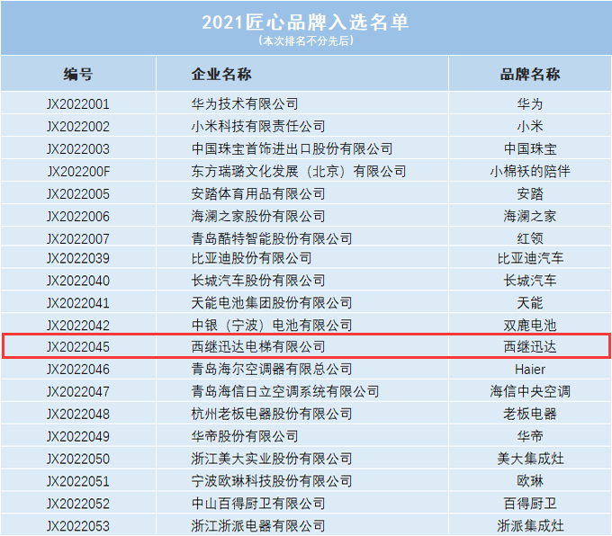 據(jù)悉,本次評價于2021年11月30日啟動,歷時三個月,共評價品牌296個,該次評價涵蓋了家居建材、家用電器、工業(yè)制造等多個行業(yè)領(lǐng)域,其中122個品牌成功入選。最終,西繼迅達得到主辦方的高度肯定,與華為、小米、海爾、安踏等多家知名企業(yè)共同入選匠心品牌榜,并被收錄至匠心品牌查詢系統(tǒng)。