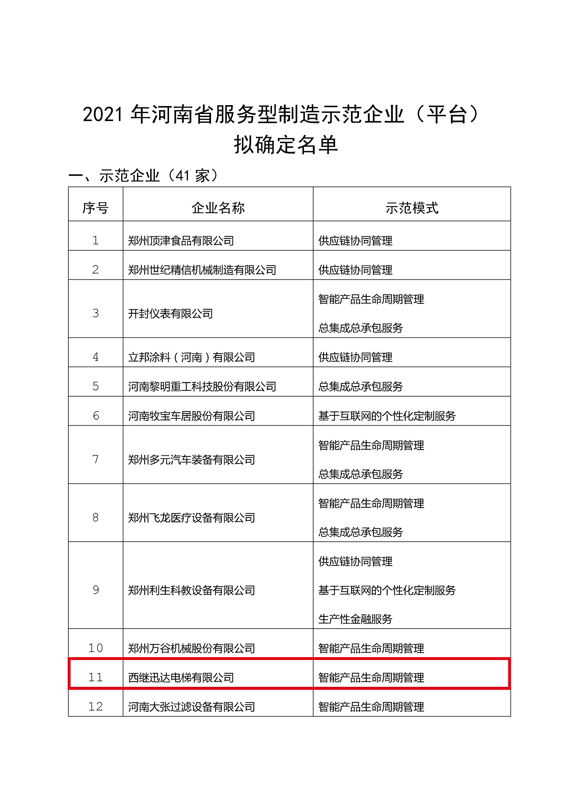 10月11日,省工信廳公示了2021年河南省服務(wù)型制造示范企業(yè)擬確定名單,西繼迅達位列此次示范企業(yè)公示名單。