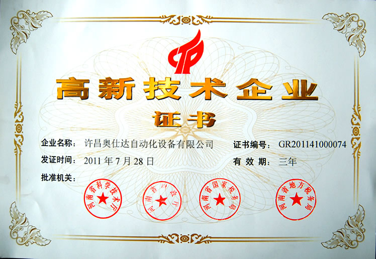 博瑪曳引機公司和威瑪德公司被列為“河南省高新技術企業”,這獎為促進西繼迅達的快速發展,推動企業做強做大,奠定堅實的基礎。