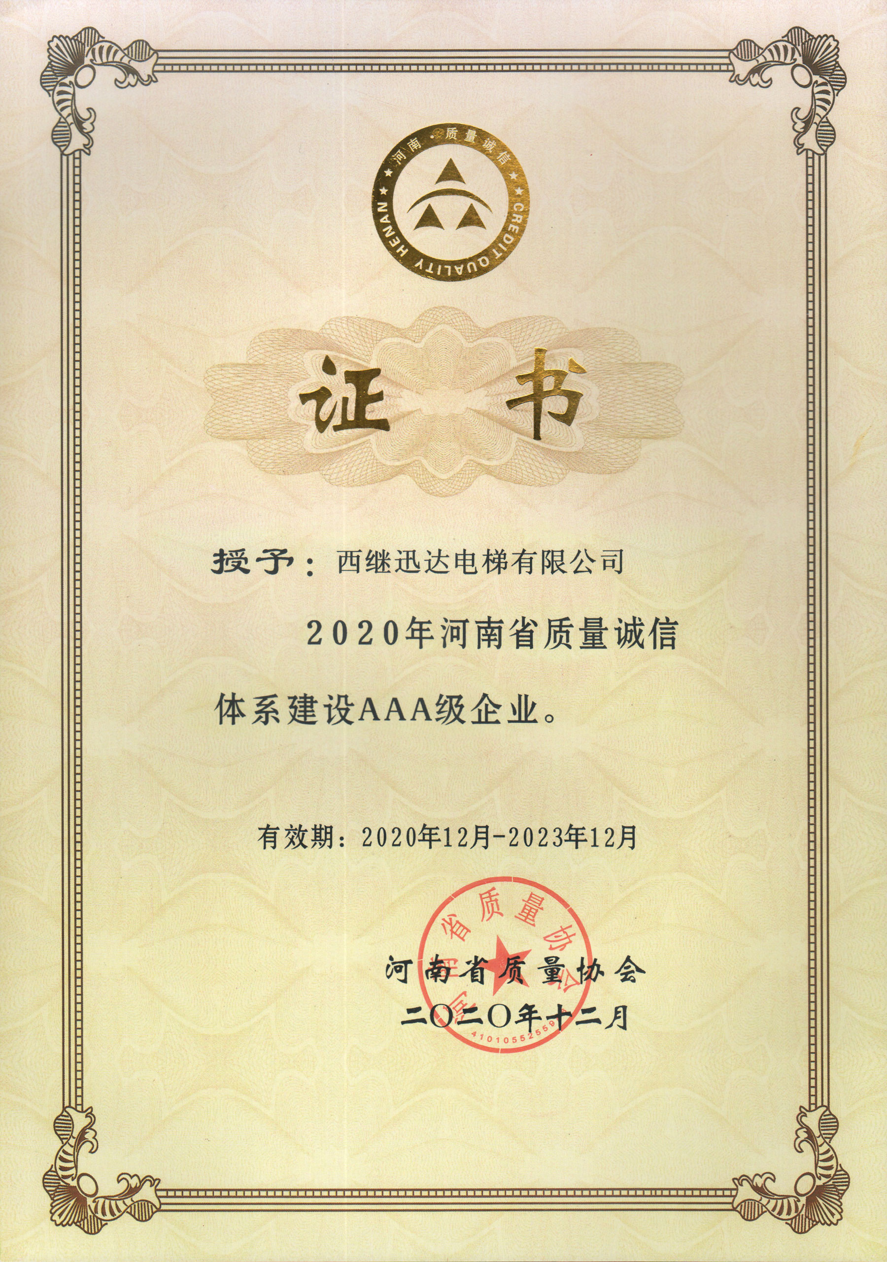 河南省質量誠信企業評估分為 AAA 級、AA級、A級企業,字母數量越多,表示質量領域信用水平越高。該稱號對企業自覺增強自身質量誠信意識,提升產品質量,增強企業的市場競爭力有極大的促進作用。西繼迅達是于2015年12月份被河南省質量技術監督管理局認定為“河南省質量誠信AAA級企業”,2018年通過復評審。2020年下半年,公司積極籌備復評審相關資料,通過上報復審資料、質量誠信等級評估、專家最終審核等程序,最后省質量協會認定西繼迅達信用良好,相關評價較高,產品質量穩定,持續認定為AAA級企業等級。