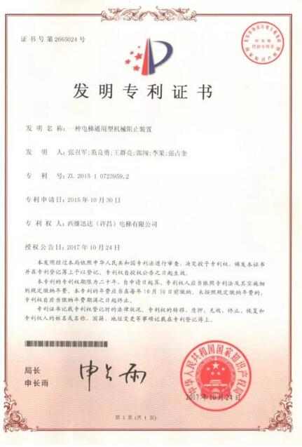日前,西繼迅達一天喜獲了國家知識產權局頒發的兩項國家發明證書,專利名稱分別為“一種電梯通用型機械阻止裝置(ZL201510723959.2)”和“電梯式機械車庫升降系統(ZL201511014798.6)”