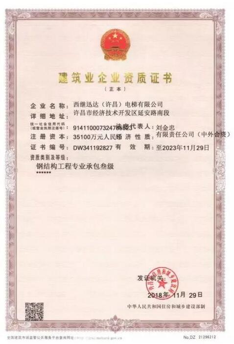 11月29日,西繼迅達電梯正式獲得住建局頒發的“鋼結構工程專業承包資質”證書。