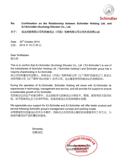 瑞士迅達發布與西繼迅達關系確認函